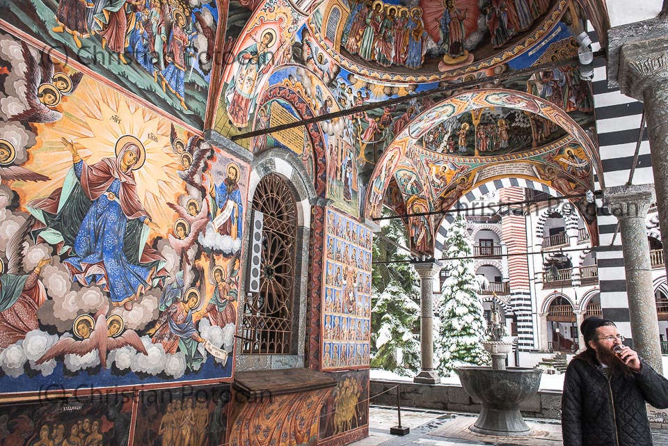 Meters of snow piled up beside the narrow gravel road up to Rila Monastery. It was January and dark clouds hung on the snow covered trees along the steep slopes of the valley. My small Lada Niva climbed up the valley bravely and after about 2 hours I reached the Monastery. Normally huge groups of visitors enliven the place but today nobody seemed to here. Maybe because of the weather, maybe because it was mid-week in winter. When I stepped through the huge main gate into the courtyard only some monks were flitting from their rooms to the main church in the center of the complex for their prayer. The monastery was established in 927 by Saint Ivan of Rila. Actually he never put one stone here, but only lived in a cave close to todays building. His students, who were educated by the hermit started to build the monastery in the shape as the complex stands today. I set myself on one of the benches in front of the main church. This was a moment of sheer beauty: light snowfall turned the place into a mystical fairy tale. The church with its wonderful frescos was illuminated by some sun rays, which made it through the clouds. A monk brought me a cup of hot tea, while I was watching the century old painted walls and I started to dream about this wonderful winter day.